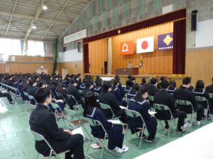 翌々日に卒業式を控えた143名は、思い出多い体育館で快い緊張感につつまれ清々しい表情を見せていました。
