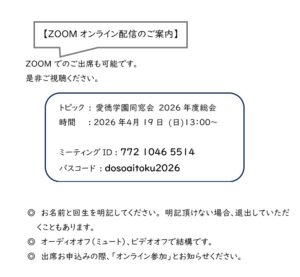 【同窓生の皆様へ】 2026年度総会:4月19日(日)13:00~ 皆様おさそいあわせの上、是非ご出席ください ご出席お申込みはこちらから→総会出席フォーム 新着情報 2026年2月20日 NEW! あいとくEXPO ボランティア募集 2026年2月13日 🌸62回生同窓会入会式🌸 2026年2月1日 アメリア基金への募金口座 2025年12月6日 待降節 2025年10月14日 学園への寄付~同窓会 会長より 2025年7月20日 会報が届いていない方へ 2025年7月19日 同窓生の訃報~会報への掲載について 2025年6月16日 愛徳学園からのお知らせ 2025年6月16日 2025年度会報修正のお願い 2025年6月10日 会報 令和7年(2025年)版 FacebookXBluesky