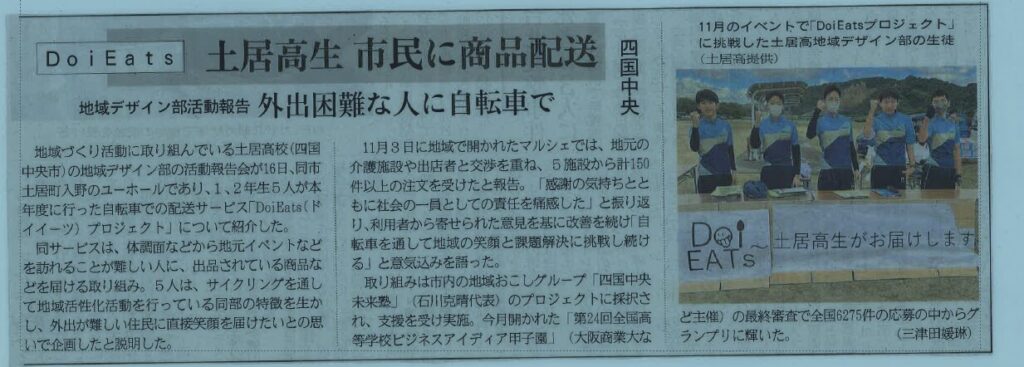 愛媛新聞記事(地域デザイン部の活動について) 2025年12月25日2026年1月13日 事務局からのお知らせ 本校地域デザイン部の活動を紹介する記事が、愛媛新聞(12/21付)に掲載されました。 【記事概要】 ・11月3日(月)地域マルシェで実施された自転車配送サービス「DoiEats」(ドイイーツ) ・12月16日(火)ユーホールで行われた活動報告会 ・12月13日(土)第24回全国高等学校ビジネスアイディア甲子園においてグランプリ受賞 【掲載許可番号】d20251225-02 FacebookXBlueskyHatenaCopy