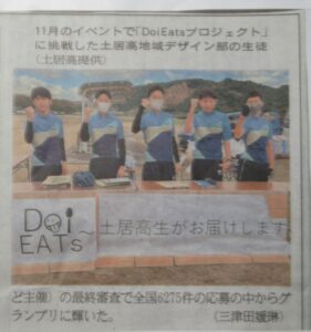 愛媛新聞記事(地域デザイン部の活動について) 2025年12月25日 事務局からのお知らせ 本校地域デザイン部の活動を紹介する記事が、愛媛新聞(12/21付)に掲載されました。 【記事概要】 ・11月3日(月)地域マルシェで実施された自転車配送サービス「DoiEats」(ドイイーツ) ・12月16日(火)ユーホールで行われた活動報告会 ・12月13日(土)第24回全国高等学校ビジネスアイディア甲子園においてグランプリ受賞 【掲載許可番号】d20251225-02 FacebookXBlueskyHatenaCopy