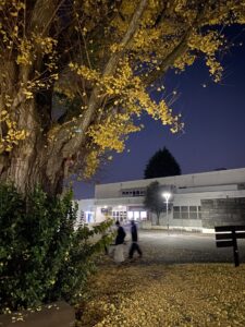 2025年秋の夕暮れ「銀杏と福利センター」