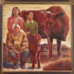 セミナーハウス2階の壁面に掲げられている水彩画「古里」は、一水会会員 久保田 辰男 先生の作品です。家族そして子牛を優しく見守る親牛の姿が印象的です。背後には茅葺の民家と田畑が広がっており、失われつつある古き良き農村の原風景です。