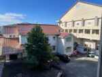 爽やかな秋空の下、南2号館3階の地歴公民準備室から眺めたセミナーハウス(葵修館)と同窓会館です。セミナーハウスは平成4年に、同窓会館は平成6年に竣工しました。いずれも東広島地域には馴染みの深い赤瓦の屋根で、朝日に照らされてキラキラと輝いています。西側には平成14年に完成した体育館がドンと構えており。また東側には5年前に建設された高層マンションが聳えています。学校周辺の景観も随分変わりました。