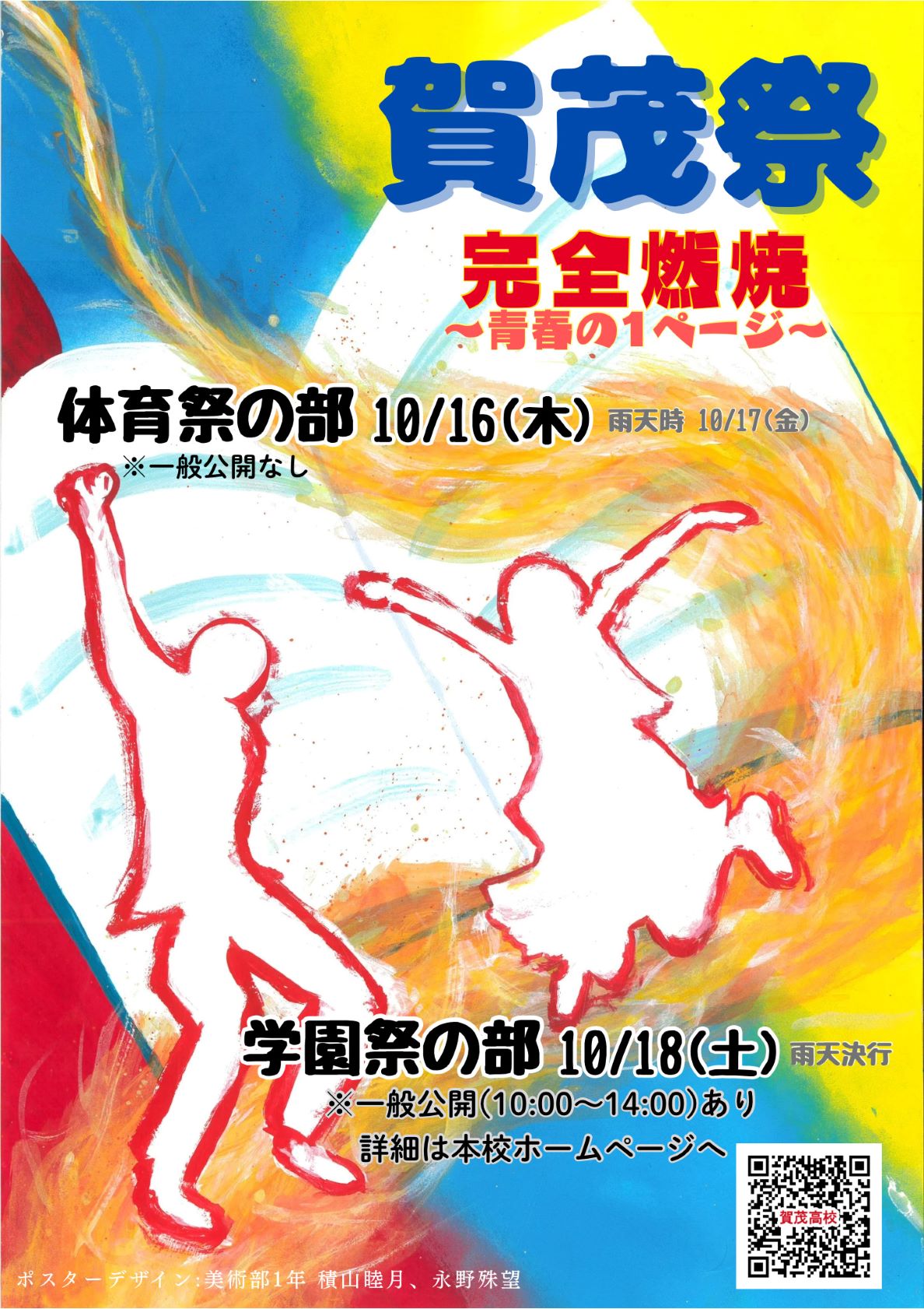 2025年10月12日 / 最終更新日時 : 2025年10月12日 kamoaoi お知らせ 賀茂祭 地元地域では3連休の土日にかけて、西条中央公園を中心に「酒まつり」が開催されました。天候にも恵まれ多くの人出で賑わったようですが、賀茂高校では連休明けの14日から18日を行事週間として「賀茂祭」を開催します。台風の接近にともない、天候が心配ではありますが、16日(木)に体育祭、18日(土)には学園祭が予定されています。同窓生の皆さんも現役生の活躍をご覧になってください。 FacebookXBlueskyHatenaCopy