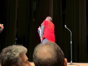 記念講演会は、本校6回生で川西市の名誉市民である元プロ野球選手の古田敦也氏から、在校生を元気づけてもらえるような内容の講演でした。記念に野球部の現役・OBから、古田氏の60才還暦を祝い背番号《60》の赤い【明峰高校野球部】のユニフォームをプレゼントしました。