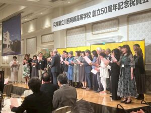 記念祝賀会は午後7時から宝塚ホテル「宝寿の間」で開催。【校歌】ができるまで1回生から3回生までの方が歌っていた《開校歌》を、作曲された宮本先生からあらためてご紹介いただき、ステージに1回生30名、2回生2名の皆さんが並んで合唱してくださいました。写真はその様子です。
