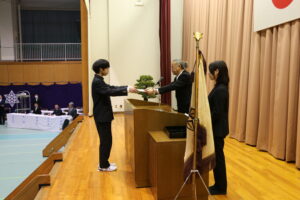 戸出克彦会長より、優良卒業生代表材料化学科倉下春樹さんに賞状および副賞を渡しました。