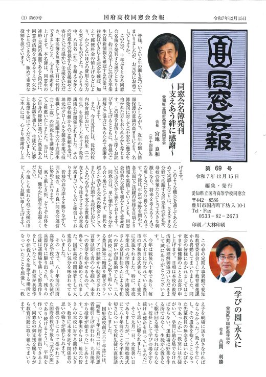 同窓会報第69号を発行いたしました 投稿日: 2025年12月19日 投稿者: 同窓会事務局 同窓会報第69号を12月15日に発行し、会報郵送希望者の方、次年度総会担当回生(28.38.48.63回生)の方、昨春卒業生の方に郵送いたしました。会報には、同窓会活動や本校在校生の活躍が掲載されています。 このHPの「 […] 続きを読む