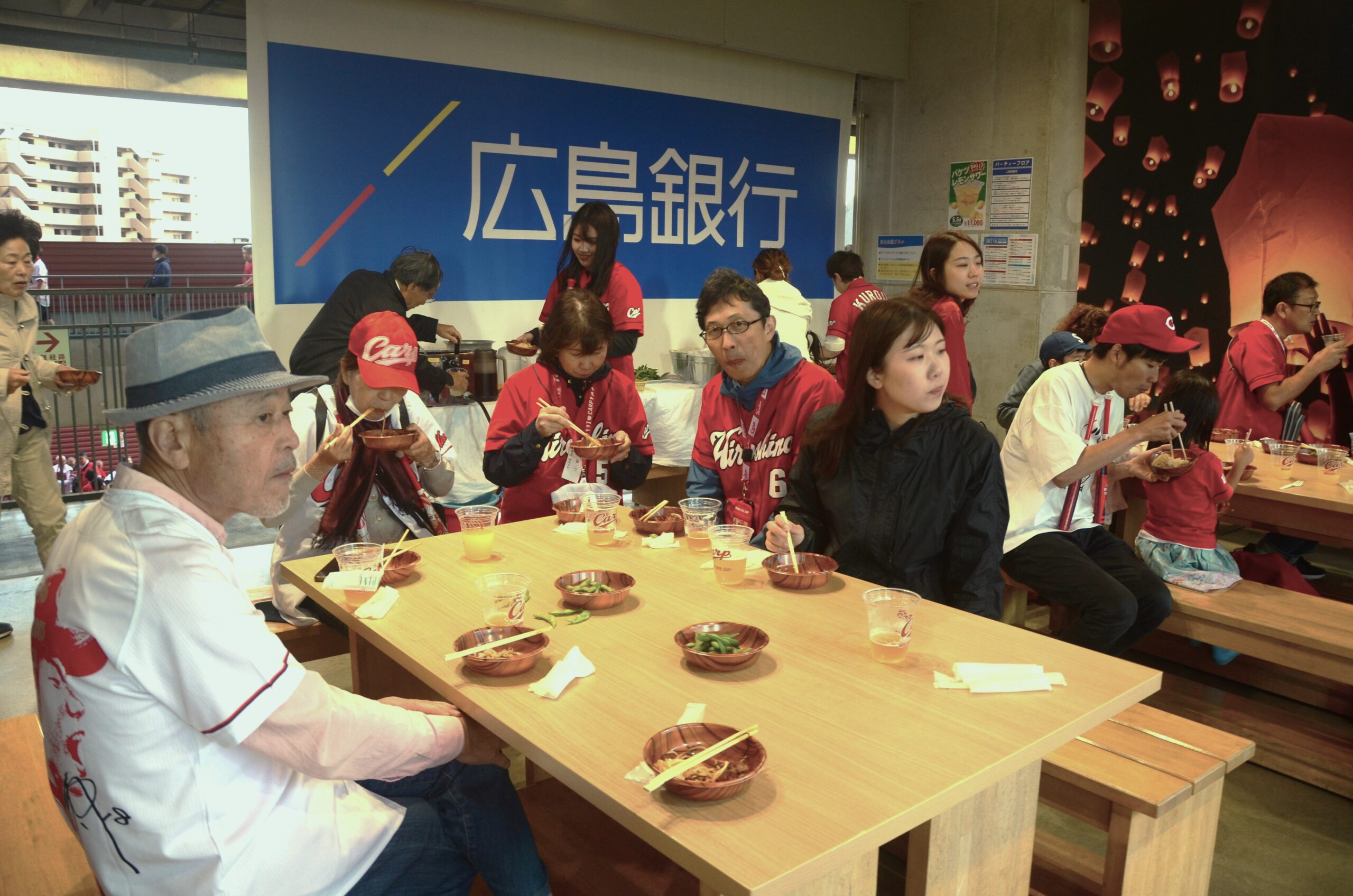 会場は、中2階一塁側パーティーフロアのうち1区画。2歳から79歳までの参加者のほぼ全員がカープファン。 一回裏、カープが末包昇大外野手の右前2点適時打で先制すると、カープのユニホームを着た広島支部会員らは応援用カンフーバットをたたいて大喜び。 先発の床田寛樹投手が、四回表、頓宮裕真内野手の犠飛による1点に抑え、続く島内颯太郎、栗林良吏の投手リレーで追加点を許さず、接戦を制する展開に大歓声を上げていた。