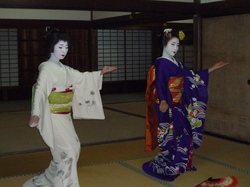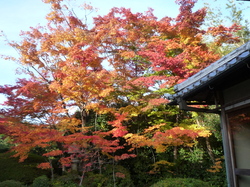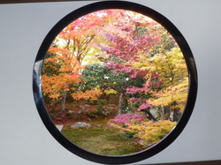 最初に訪れたのが常照寺です。山門をくぐるとそこは眼の覚める様な紅葉で華やかな雰囲気に包まれていました。次の源光庵では丸窓「悟りの窓」と角窓「迷いの窓」にしばし魅入りました。次の光悦寺では有名な光悦垣を見学、最後に訪れたのは妙心寺退蔵院です。御説明の後お若い舞妓さんと芸妓さんの舞にうっとり致しました。そこから見事にライトアップされた名庭に感激しながら会食場所となります別棟まで移動致しました。さすがミシュランの星に輝く「阿じろ」の精進料理は絶品でした。ここでも先程の舞妓さんと芸妓さんが各テーブルを廻って下さり私達の質問攻めにも、一つ一つ笑顔で答えて下さり、その美しさと健気さに感服致しました。