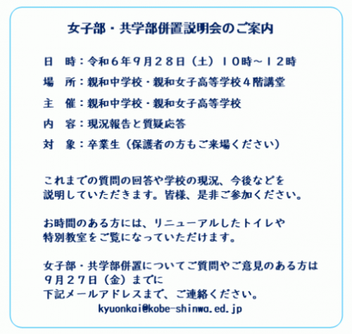 9月28日(土)に女子部・共学部併置説明会が、本校講堂にて開催されます。