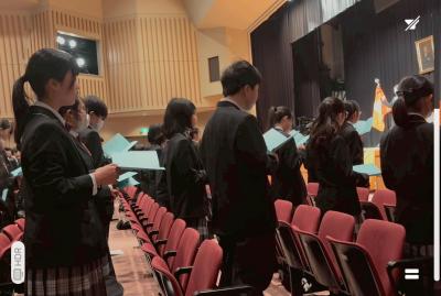 入学生にとっては初めてのことですので、ピアノ演奏と指揮のもと、コーラス部員と一緒に歌いました。