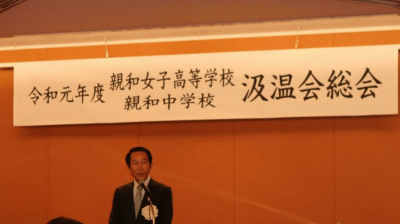 続いて竹内弘明名誉会長の挨拶がありました。昨年学校にラーニングコモンズが完成したこと、今春の進路状況、クラブ活動の様子など、報告してくださいました。