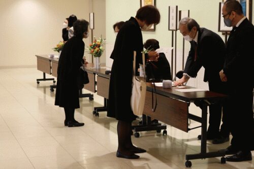 今年も昨年に引き続き新型コロナウィルス感染対策で、正面玄関に消毒用アルコールが備えられ、遺族、参列者の方々には消毒の後、受付をして頂きました。