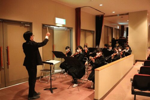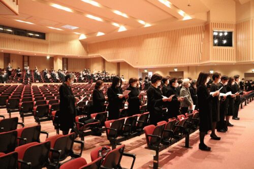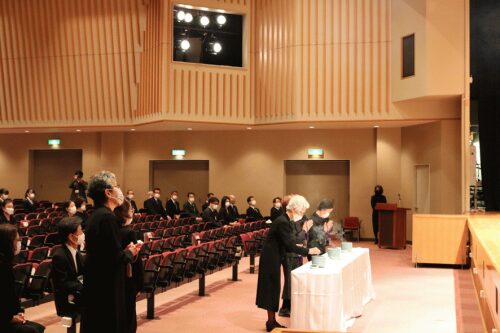 その後、校祖追悼の歌が演奏されました。昨年はコロナ感染対策で、録音されたものが流されましたが、今年は器楽部による生演奏です。参列者は昨年に引き続き心の中で歌いました。
