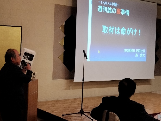 支部報告 九合支部 支部報告 2025.02.08 2月8日(土)18:30より。太田グランドホテルにて 元講談社副社長の森 武文様による講演会が催されました。 演題:「今だから話せる週刊誌の裏話」 これだけやったのに大きなトラブル1件もなし 訴えられたこともなし できるだけ早く現場に行く、立ち会う 常に取材相手に会い、確かめ、言い分も聞く 10のことを7から8にする。滅多切りにしないでミネウチ 自分の身の回りにきれいに 権力者は徹底的に叩く 総会の後、懇親会が催されました。 FacebookXBlueskyHatenaCopy