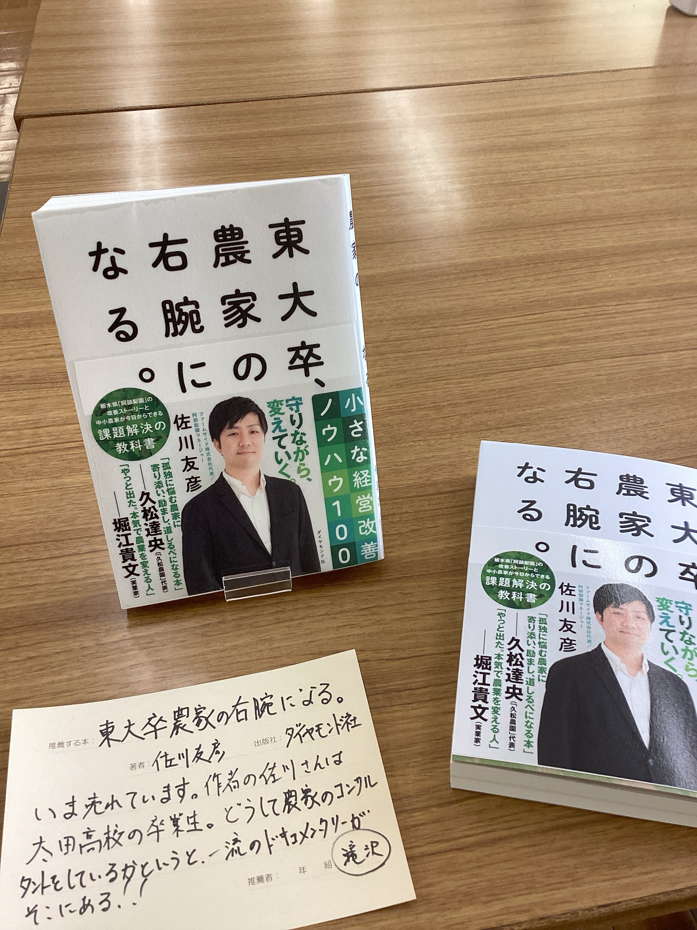 お知らせ事務局からのお知らせ同窓会からのお知らせ 【図書館に寄贈】『東大卒、農家の右腕になる。小さな経営改善ノウハウ100』(ダイヤモンド社) お知らせ 2026.02.10 本校の卒業生で、ファームサイド株式会社代表取締役、農業経営コンサルタントの佐川 友彦(高58)氏より、著書が図書館に寄贈されました。 この本は、今ベストセラーになっており、本校の職員や生徒の間でもファンが多い本です。 サインだけでなく、生徒に対するメッセージがびっしりと奥付ページに記されており、手に取った生徒も感動です。 農業に関心がない方でも、一流のドキュメンタリーとして楽しめるはずです。ぜひ、ご一読ください。いま、うれてます!!! FacebookXBlueskyHatenaCopy