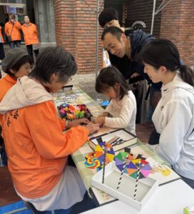 毎年恒例となった出店ですが、今年は遊びメニューを、スーパーボールすくい、輪投げ、折り紙で作るペロペロキャンデーの3つに絞り、全てチャレンジした方には、くじ引きで昔の駄菓子屋風のおもちゃが当たる、という内容にしました。光るボールを懸命にすくい、好きな色の折り紙とパーツを組み合わせて自分だけのキャンデーを作るお子さんや、人より遠くから輪を投げて全部成功する方、今年も楽しみにして来たよと言ってくださる方達もいて、お迎えする私達も一緒に笑顔になった一日でした。当日は小雨が降る肌寒い天気でしたが、テントには60名ほどのお子さんをはじめ、多くのお客様がご来場くださいました。