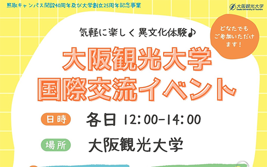 【お知らせ】国際交流イベントのご案内 ~ 留学生と地域住民の皆様と共に楽しむ一日 ~ 投稿日: 2025年4月22日2025年10月23日 投稿者: 同窓会事務局 大阪観光大学では、毎年学生のみならず地域の皆様にもお楽しみいただいている国際交流イベントを、今年度も開催いたします! 今年度は韓国・ベトナム・中国・ネパールの各国をテーマとしたイベントとスポーツ大会を開催し、みなさまに新 […] 続きを読む