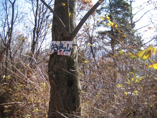 昼食が終わりやっこらさと腰をあげて前方を見ると、ドーム状の矢平山が聳えていました。まだあれを登るのかと参ったような声を出した人がいました。道は更に急になり、岩角をつかんでよじ登らなければなりませんでした。それでも昼食を食べて力が付いたお陰で1時間ほどで矢平山の頂上に立つことができました。
