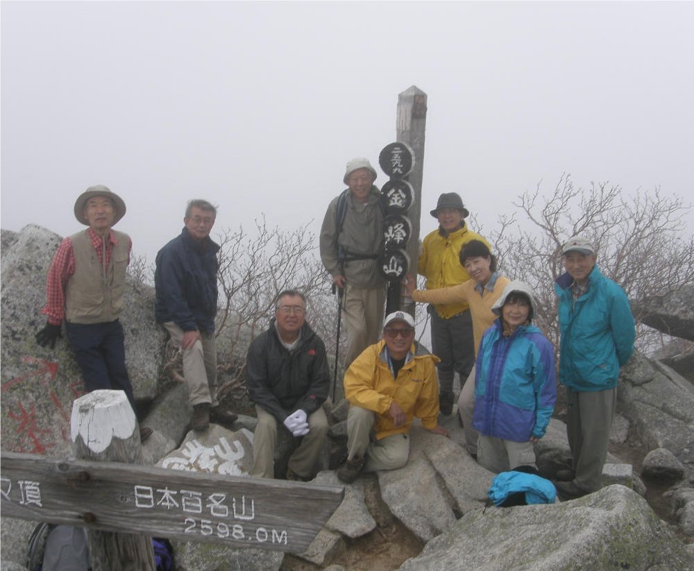 それはさて置き、元気会の面々は朝日岳までは快調に飛ばした。太陽は出ないものの雨は降りそうもなく、下界も一部見えてきた。朝日岳で昼食を取り、しばらく休んだ。休みの合間はやはり中学時代の話となる。何回も聞いたことのある話もあれば、半世紀以上経って初めて聞く話もある。昔の話は何時間しゃべっていても飽きない。