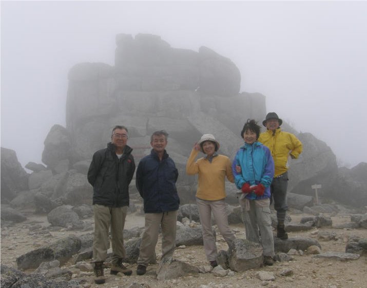 結構へばったころ岩場に差し掛かった。頂上は近い。岩に這いのぼり、ぜいぜい言いながら進むこと暫し、やっと金峰山の頂上に到着した。流石有名な山なので先客が何組もいる。