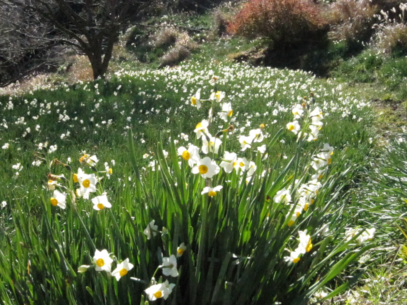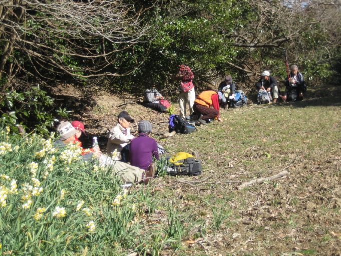 昼食を取った場所は南向きで昔は畑になっていた所で、水仙もちらほらと咲いていました。例によって中学時代の昔話に花を咲かせ、果物やおやつを交換しているうちにあっという間にお昼は終わりました。