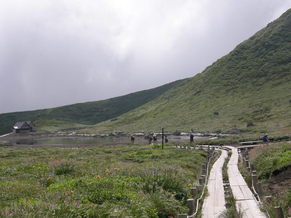 午前中お天気はOKと踏んで、暑いけれど快い道を片倉岳を巻いて男女岳(おなめだけ)直下の阿弥陀池を目指します。夏休みの真ん中なのに登山者も少ない静かな山域です。阿弥陀池はお皿に水を張ったような浅い沼に見えました。澄んだ水に流れる雲を映しています。池から秋田駒の山頂へは登り易そうな道がジグザクにつけられ登山者を招いているようです。秋田駒ケ岳(男女岳1637m)最高峰は、近くに乳頭山、少し離れた岩手山などが望まれる展望の良い山です。遠望はイマイチでしたが周辺の美しい緑の山々を堪能しました。