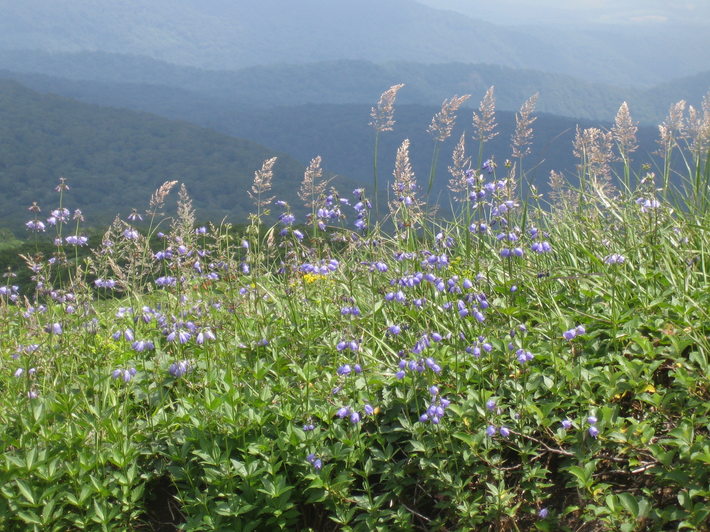 八合目へは30分弱で到着。久しぶり、準備運動にラジオ体操第一などやってから、登山道へ。緩やかな歩きよい道です。優美な起伏を見せる稜線には黄色いトウゲブキや紫色のハクサンシャジンが目につきます。