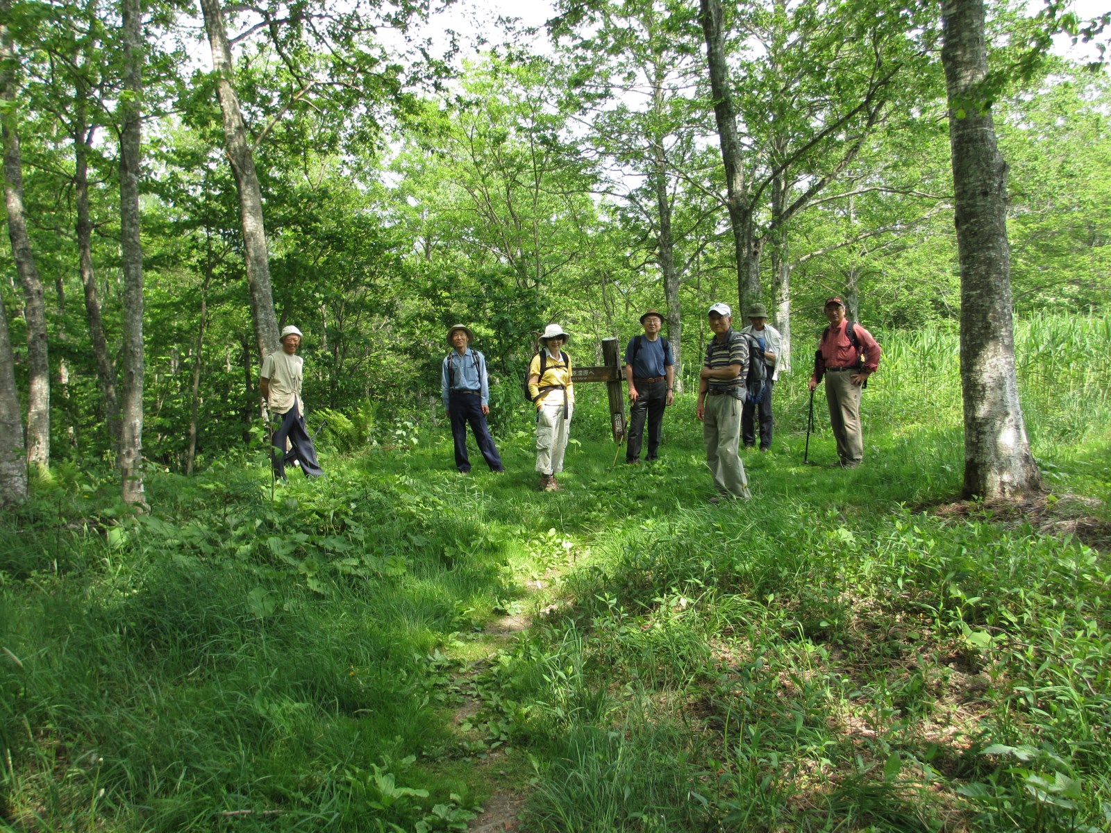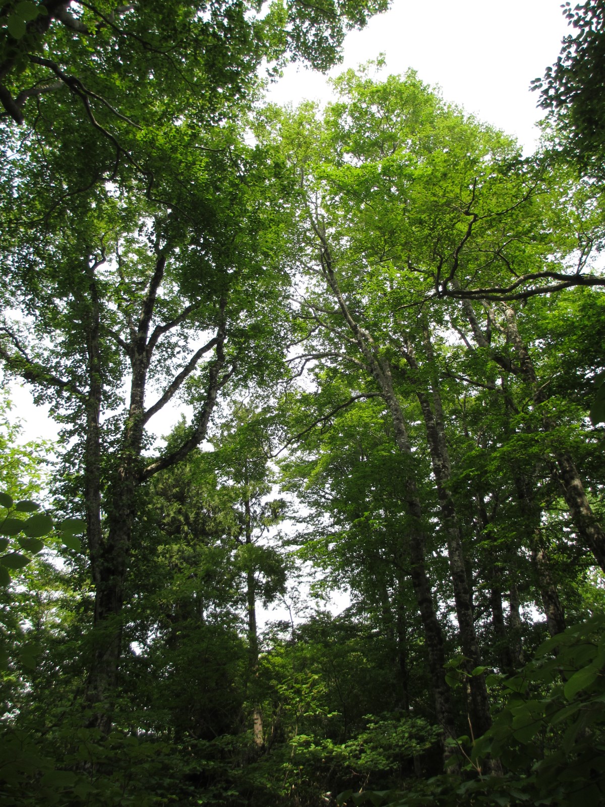登山路は湿りを含み一足一足山靴を包み込んでくれるような快さです。ブナの森、ブナの山、その中を涼しいかぜが爽やかに吹きぬけます。梅雨時の蒸し暑さはまったくありません。見上げれば青空、降り注ぐ木漏れ日に丈高いブナの木がさわさわとそよぎます。
