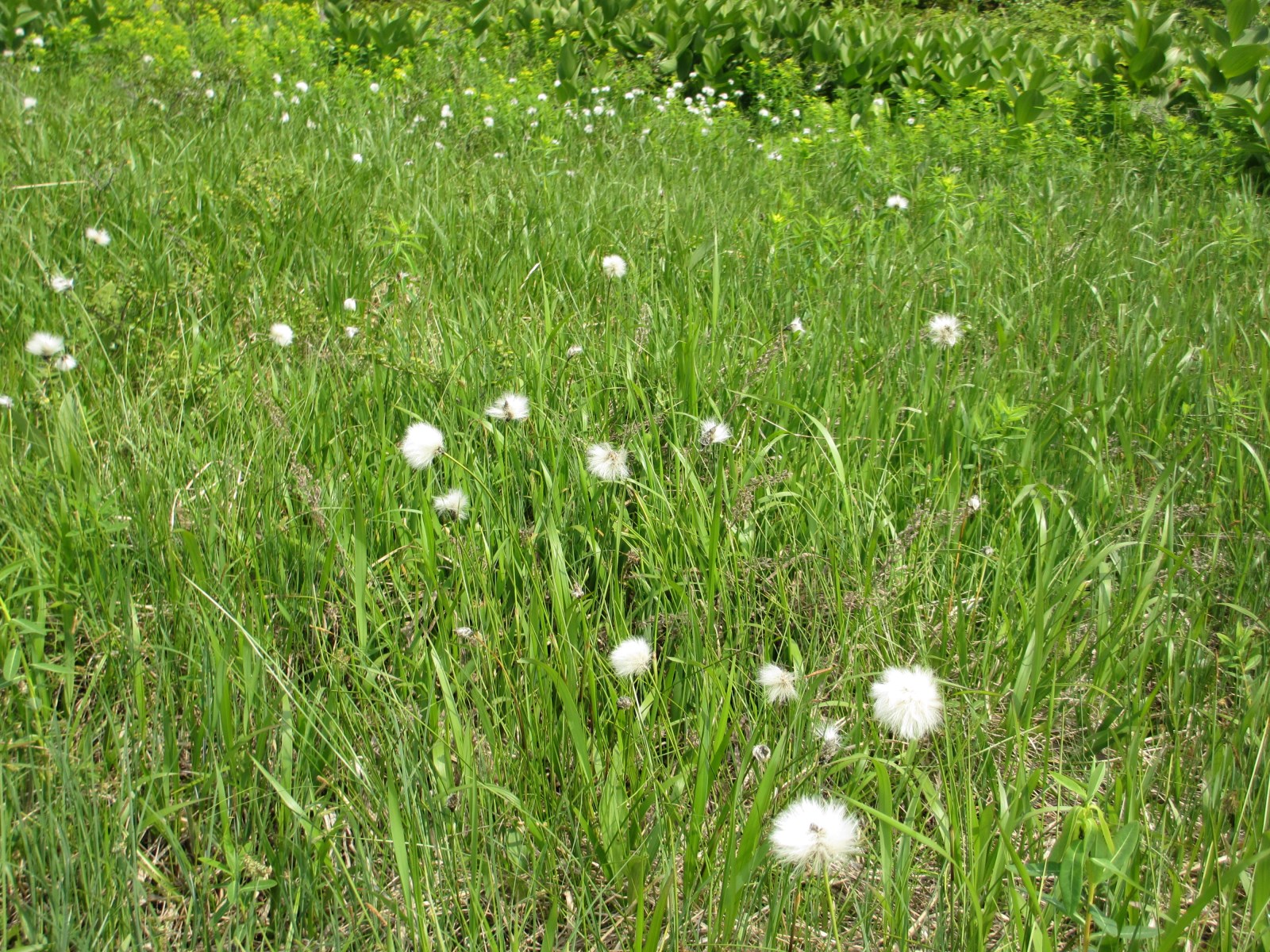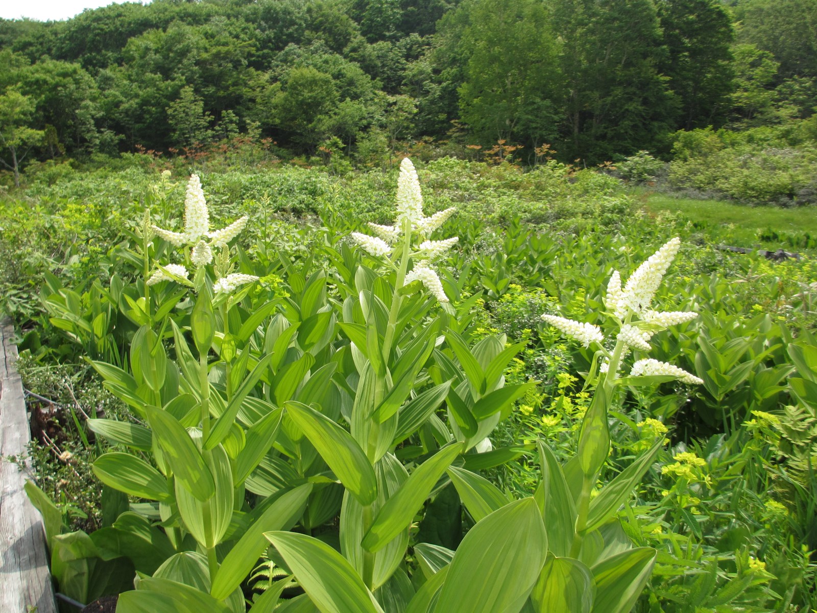 山を下って玉原湿原へ。湿原の花は端境期で少し寂しい。水芭蕉は終り、菖蒲は紫のつぼみが開く直前です。勢いよく咲いているのはコバイケイソウと綿スゲ、共に白い花です。木道を一廻りして、登ってきた尼ヶ禿山を確認し、高原のセンターハウスに戻りました。