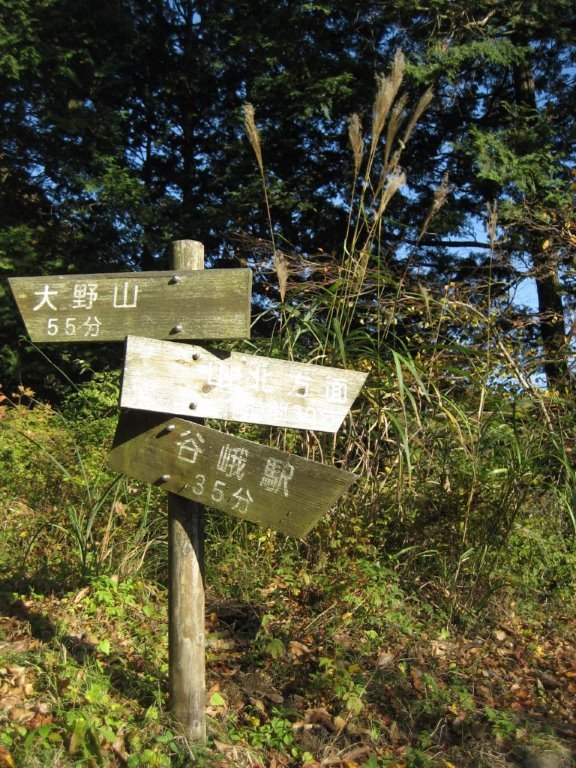 登山路は雑木林、植林の中につけられた緩やかな道である。木々の間から丹沢の山々を垣間見ながら登る。秋晴れというにふさわしい青空から、暖かい日差しが降り注ぎ爽やかな風が吹き抜ける。木々は秋の色に染まり始めていて美しい。牧草地帯の柵が現れると横木で作られた階段状の登りになる。この階段がなかなかキツイ。放牧の季節ではないので牛の姿は見えないが、ところどころに牛舎らしい仮小屋がある。途中で麓からの車道と合流したりするが、車が登ってくる気配もなく、あくまでも静かな山路である。やがて広々とした大野山山頂に出る。