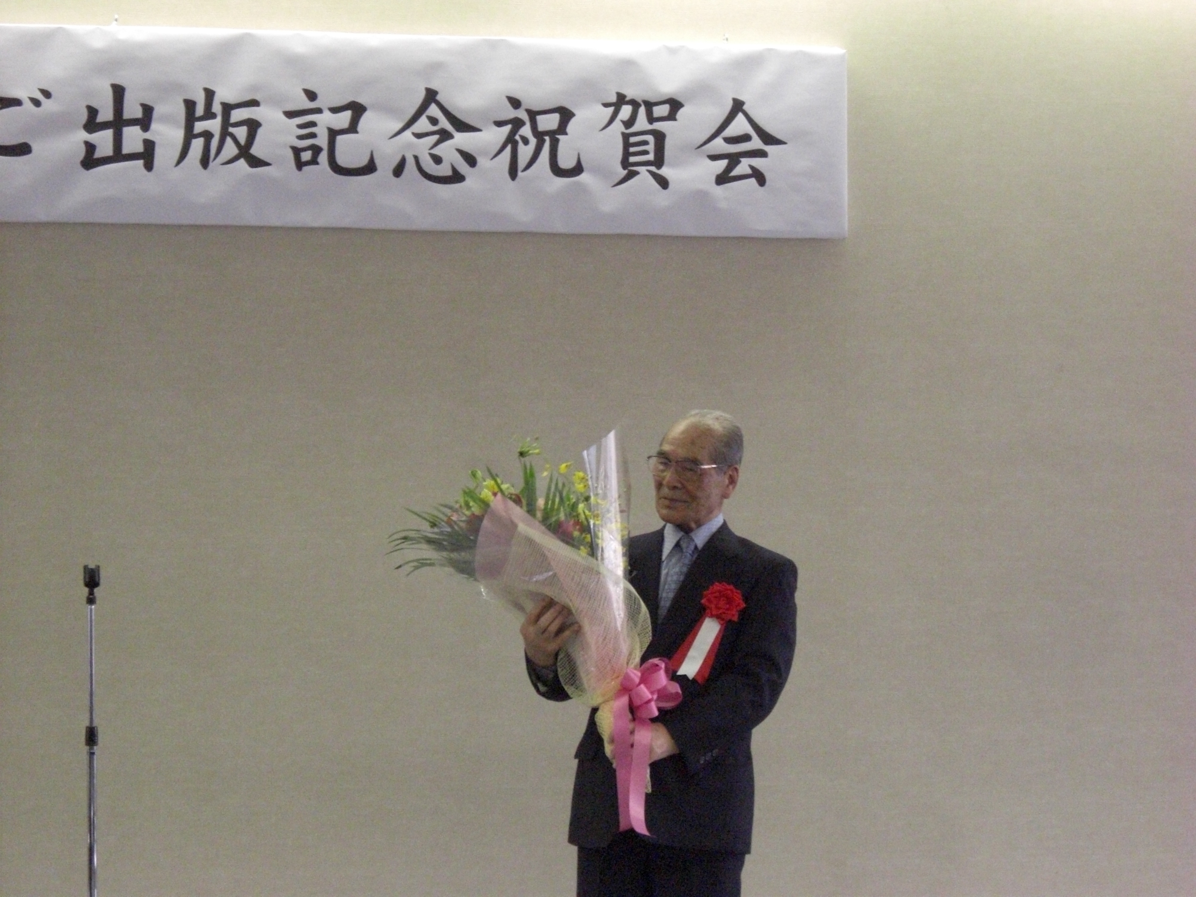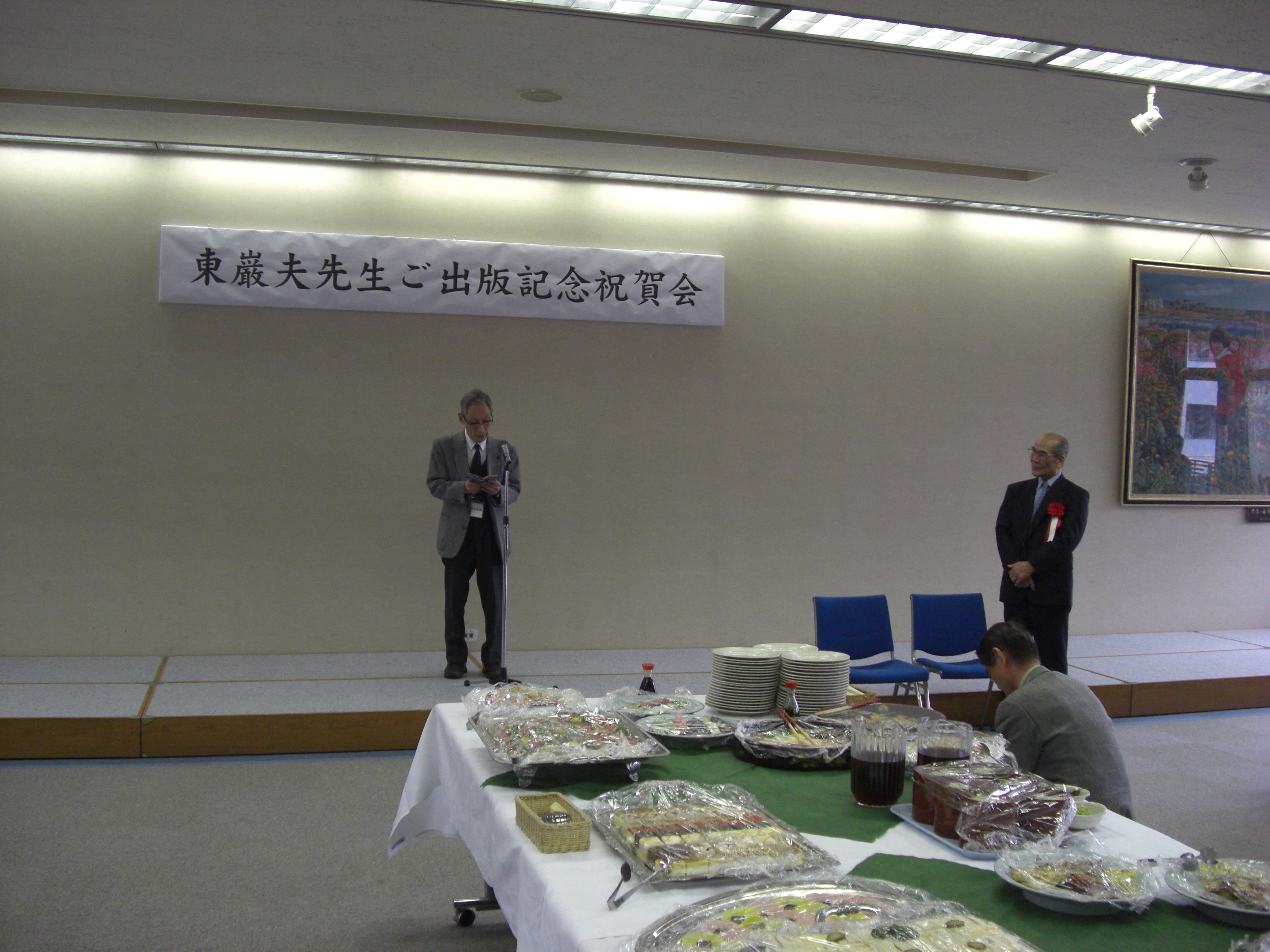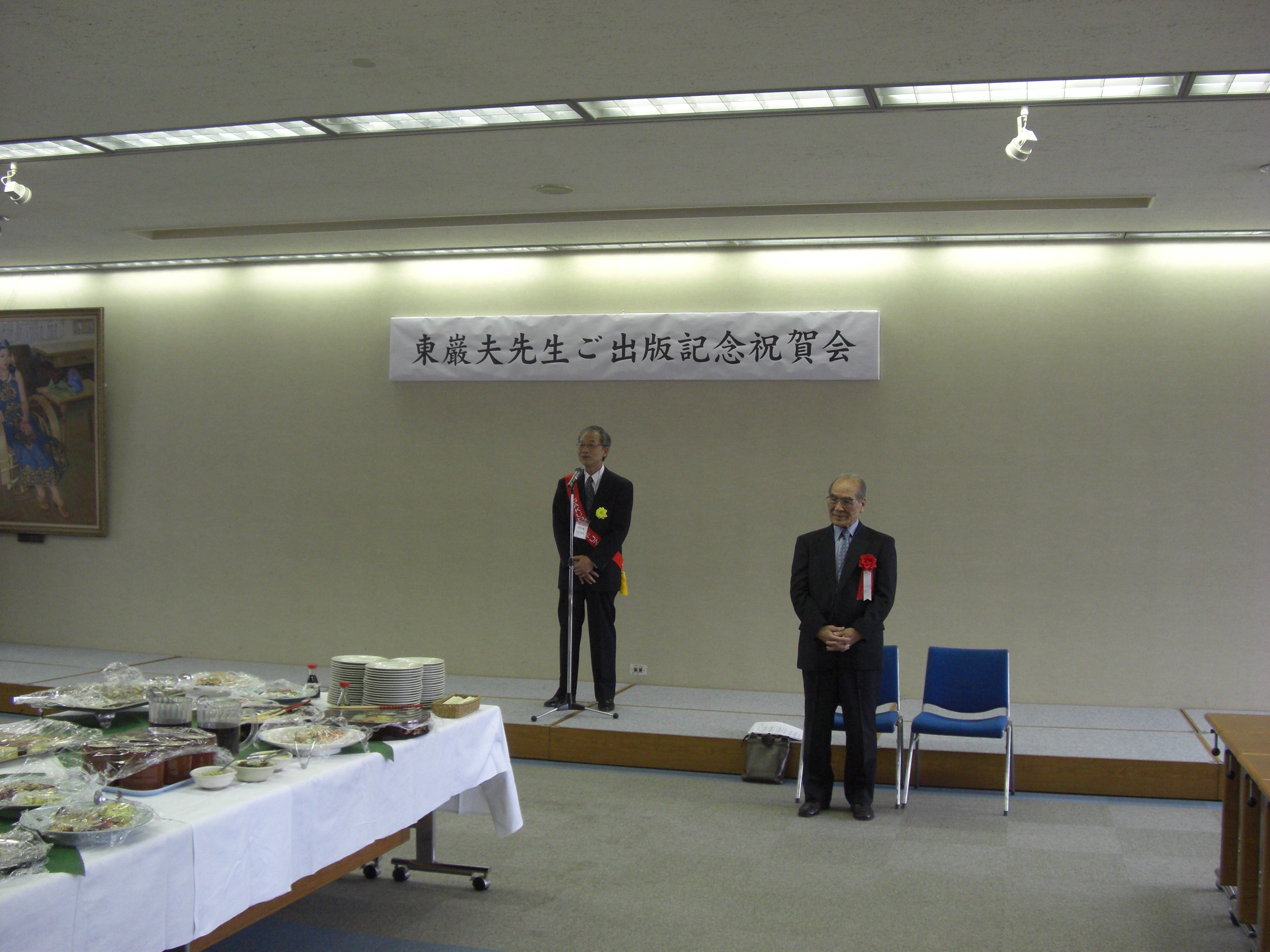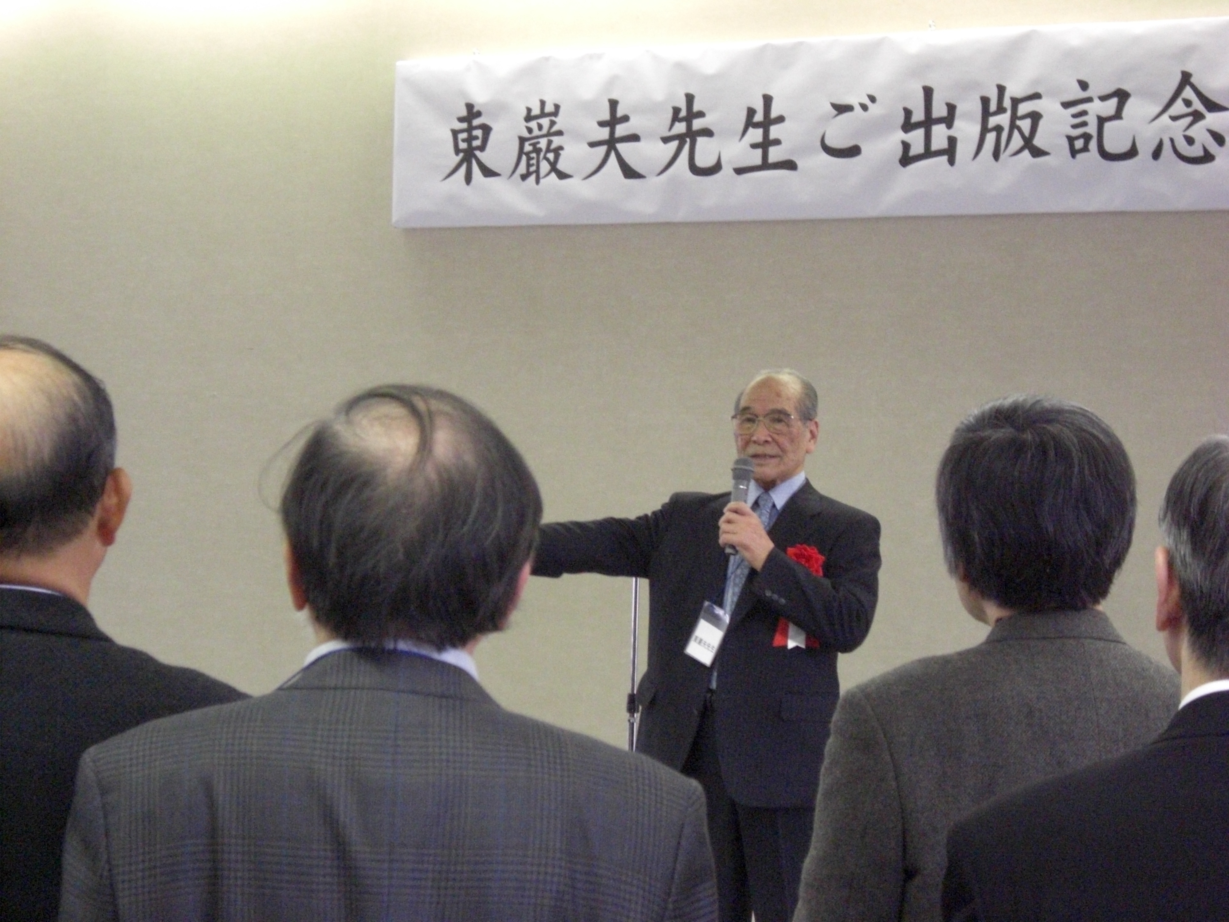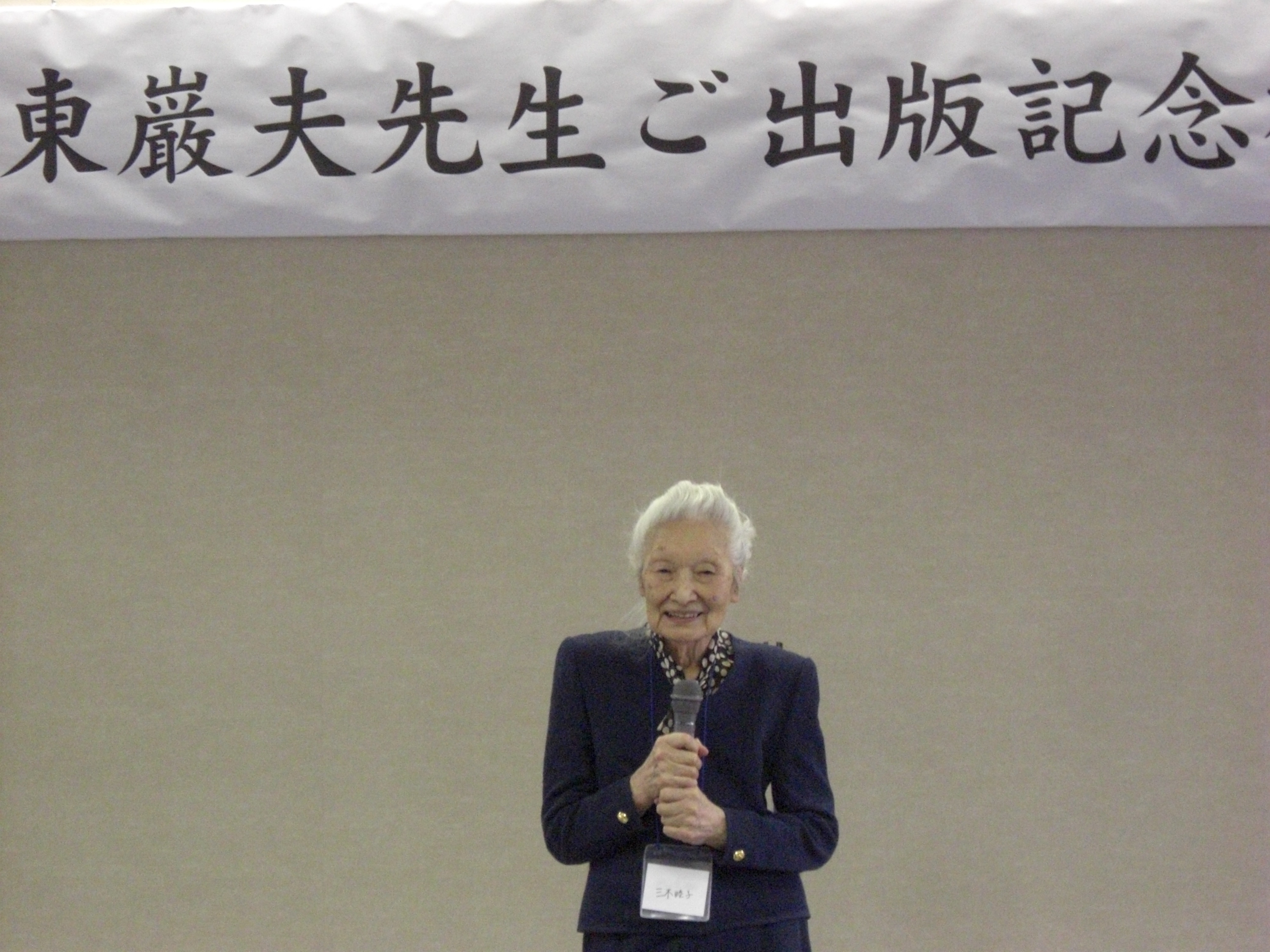 その後皆で東先生を囲んで和やかな懇談を行い、大変楽しいひと時を過ごしました。会も終わりに近くなり東先生が再度壇上に立たれ、本を書くようになったいきさつなどお話し下さいました。最後に三木睦子さんがご挨拶され東先生のご交際の範囲の広さに驚かされました。