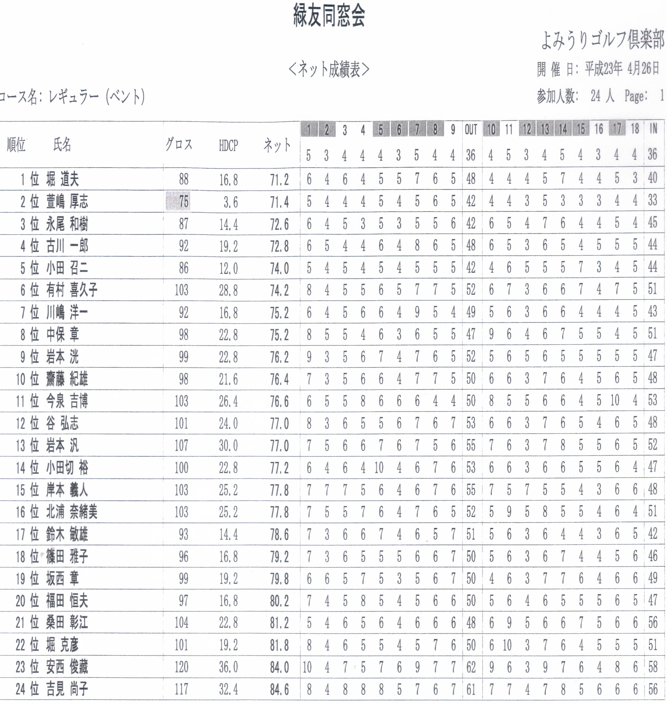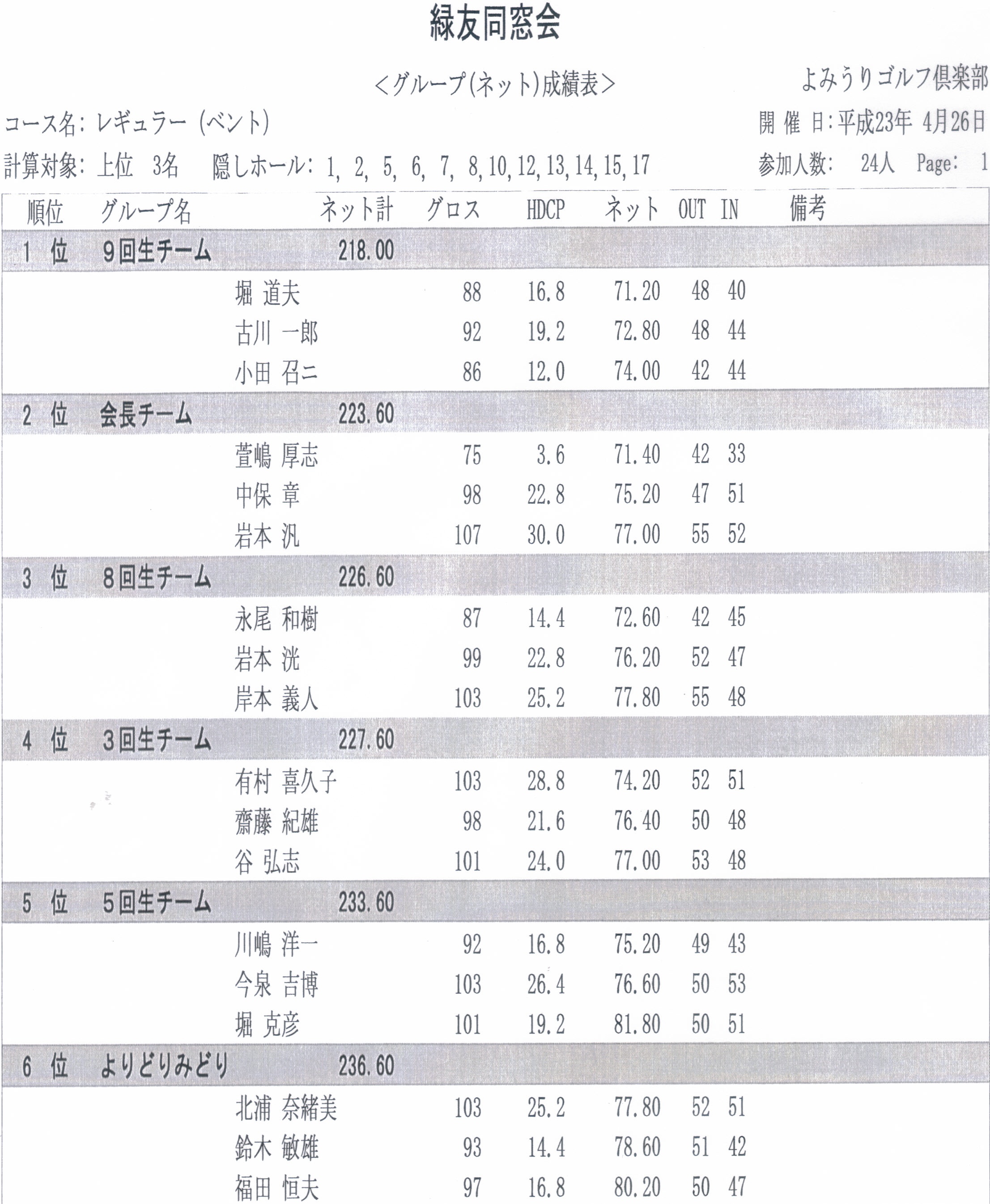 緑友ゴルフ 2011.05.14 緑友同窓会のイベントの一つである緑友ゴルフは4月26日(火)に開催され、24名の方が晴天のもとゴルフを楽しくプレーされました。プレーの結果は各回ごとのチーム戦、および新ペリアによる個人戦に分けてそのスコアーを競いました。 チーム戦 個人戦