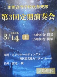 3月14日土曜日の15時から西区民文化センター大ホールにて開会された山陽高校吹奏楽部定期演奏会に行って参りました。