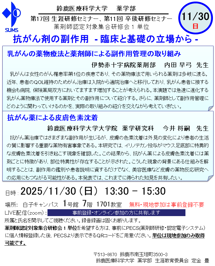 この度、令7年11月30日(日)に第12回薬学部同窓会及び生涯研修セミナーを開催することとなりました。
