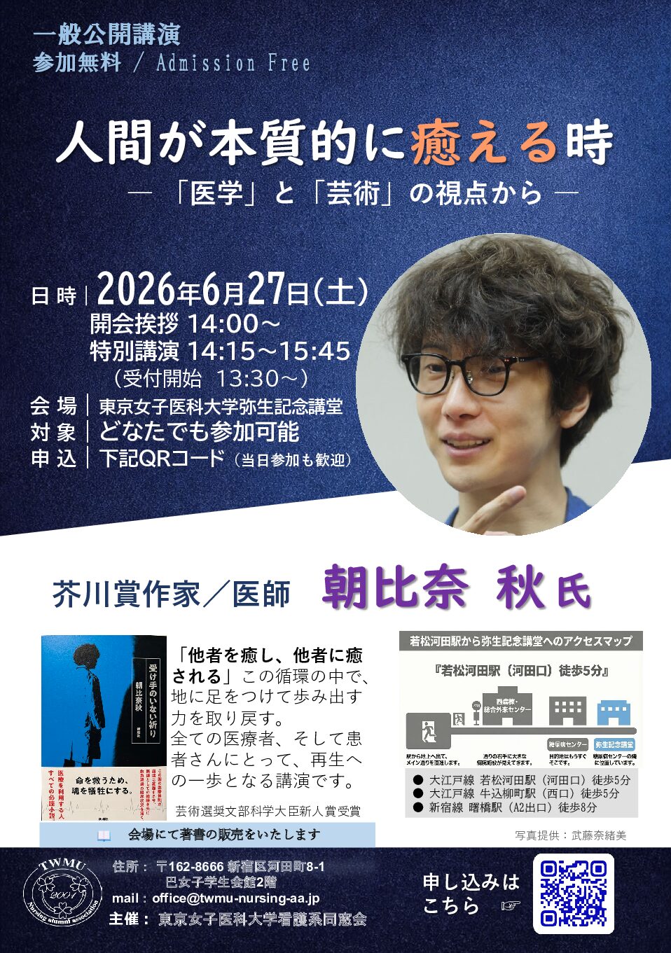第26回 定例総会・特別講演会 開催のご案内:2026年6月27日開催 投稿日: 2026年4月16日2026年4月17日 投稿者: twmukangokei 東京女子医科大学看護系同窓会では、第26回定例総会および特別講演を開催いたします。本年度の特別講演は、芥川賞作家であり医師の朝比奈 秋氏... 続きを読む