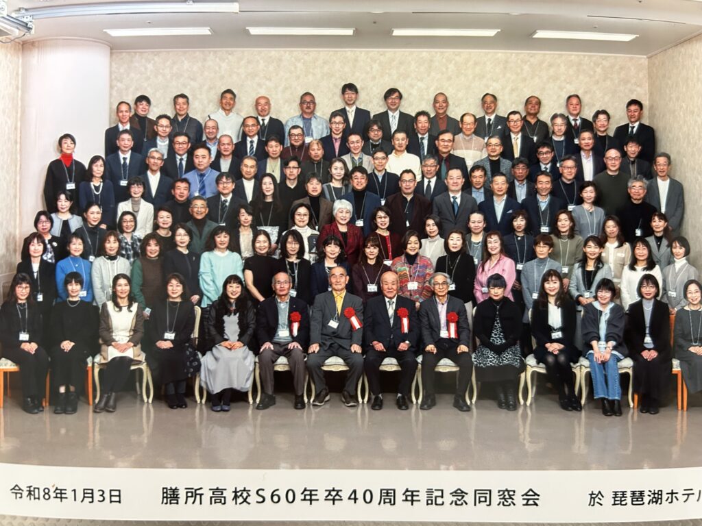 6回目ともなれば「もうそろそろやろうかな」「そやなぁ」と幹事二人で約1年前に話してとりあえず場所を押さえ、数回打ち合わせてのゆるい準備となりましたが、令和8年1月3日晴れ渡る絶景を臨む琵琶湖ホテルに於いて、山本正史先生、山川悟先生、森野邦彦先生、須田武志先生、宮下ゆたか先生をお迎えし卒業生107名が集い、40周年記念同窓会を開催しました。
